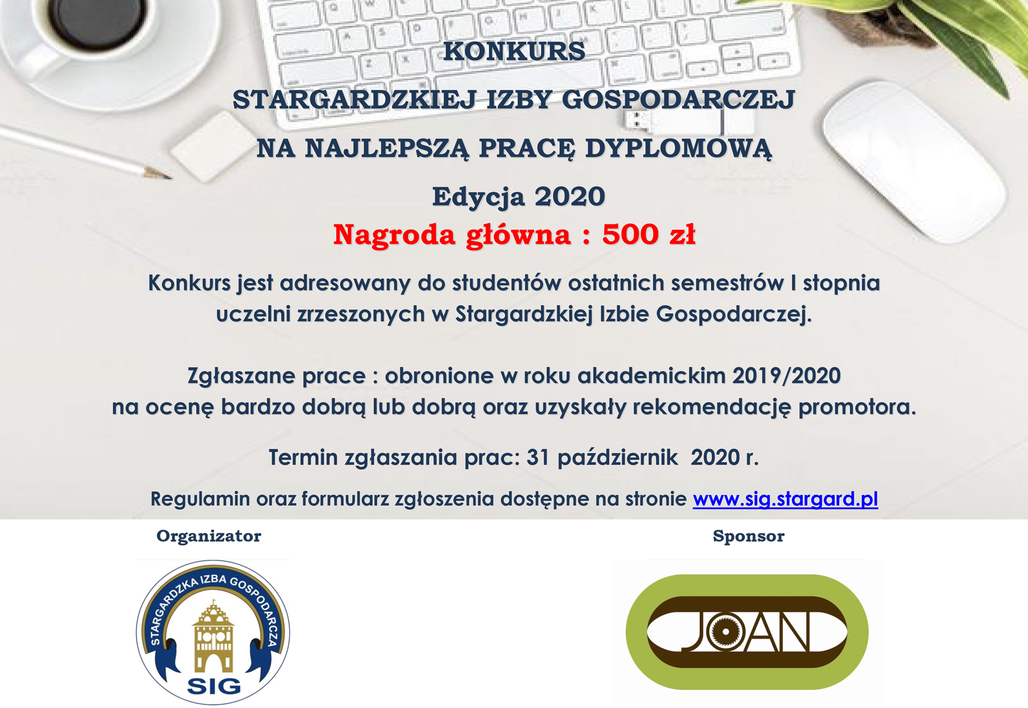 2 Października 2020 Konkurs Stargardzkiej Izby Gospodarczej na najlepszą pracę dyplomową Regulamin Konkursu na Najlepszą Pracę Dyplomową 2020 Formularz zgłoszeniowy do Konkursu SIG na Najlepszą Pracę Dyplomową 2020